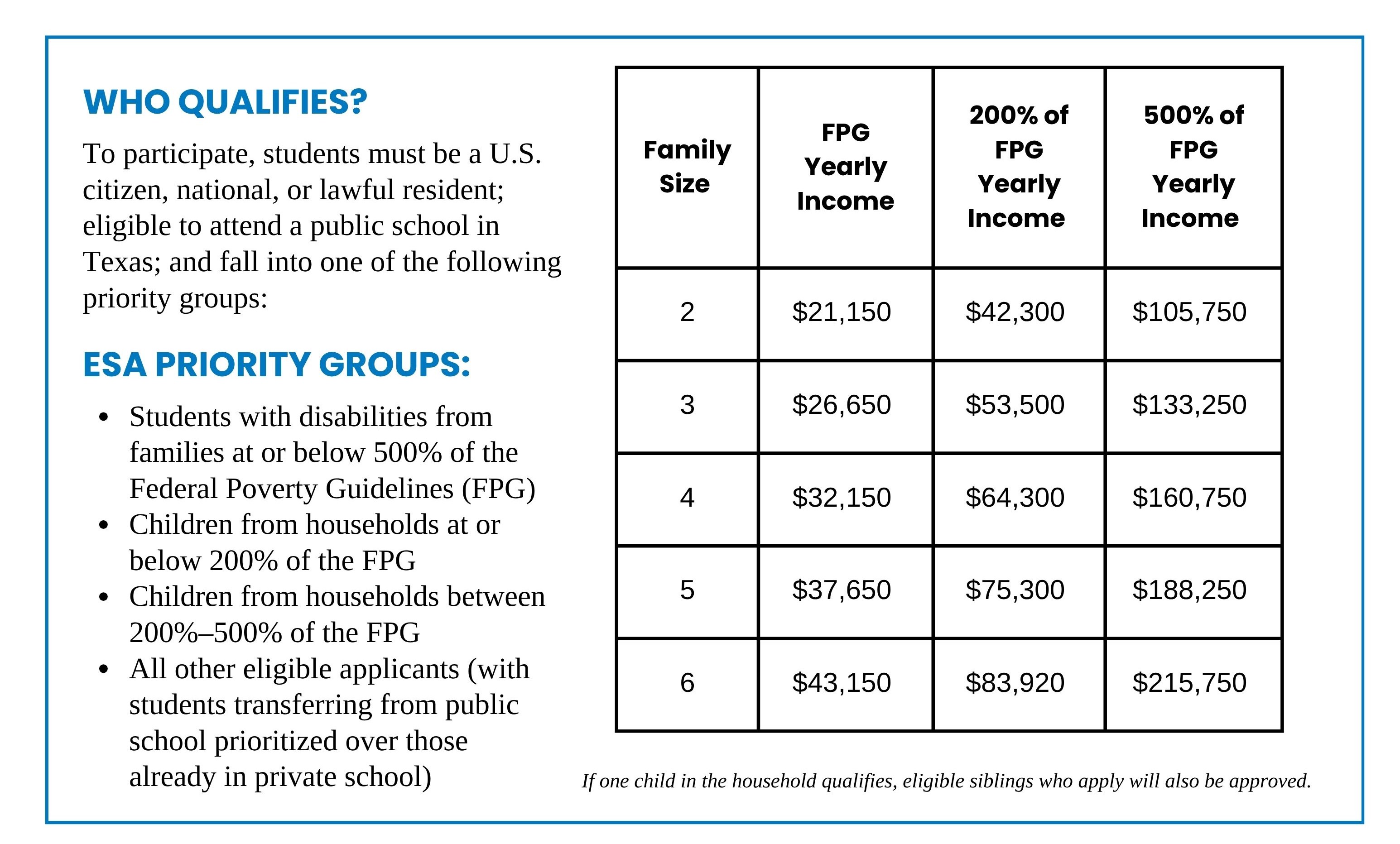 To participate, students must be a U.S. citizen, national, or lawful resident; eligible to attend a public school in Texas; and fall into one of the following priority groups: